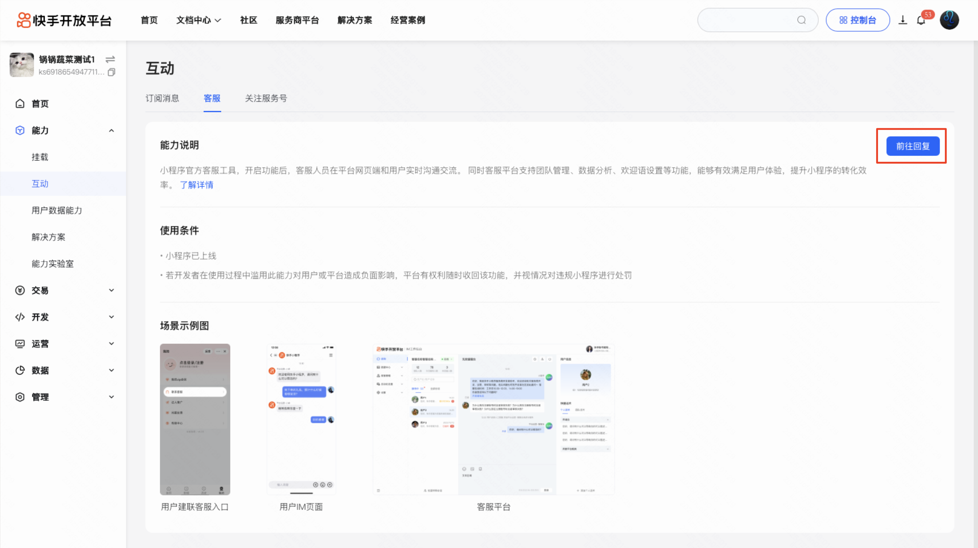- 在 能力-互动-客服 页面点击「前往回复」按钮,即可进入客服工作台