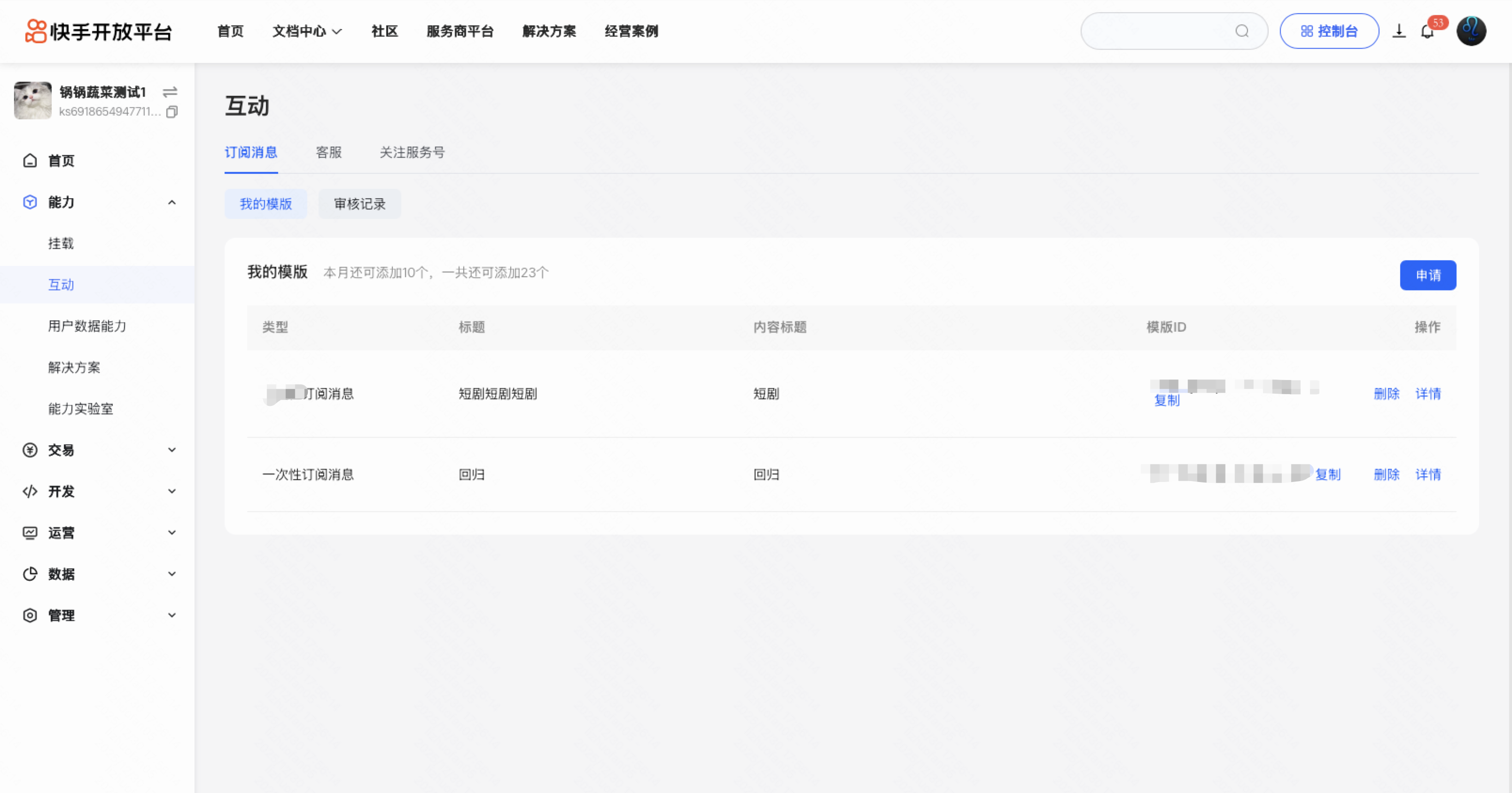 在“能力-互动-订阅消息 (opens new window)”模块申请消息模版,审核通过后可以得到对应的“模版ID”