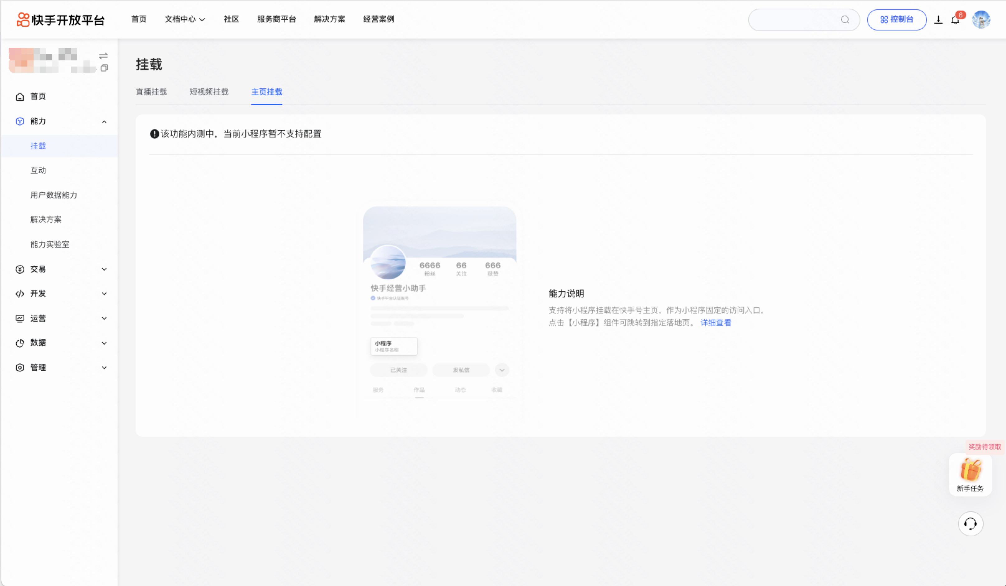1、权限配置后,升级快手app版本大于11.7.10,在“快手app-侧边栏-小程序中心-主页挂载”配置小程序页面