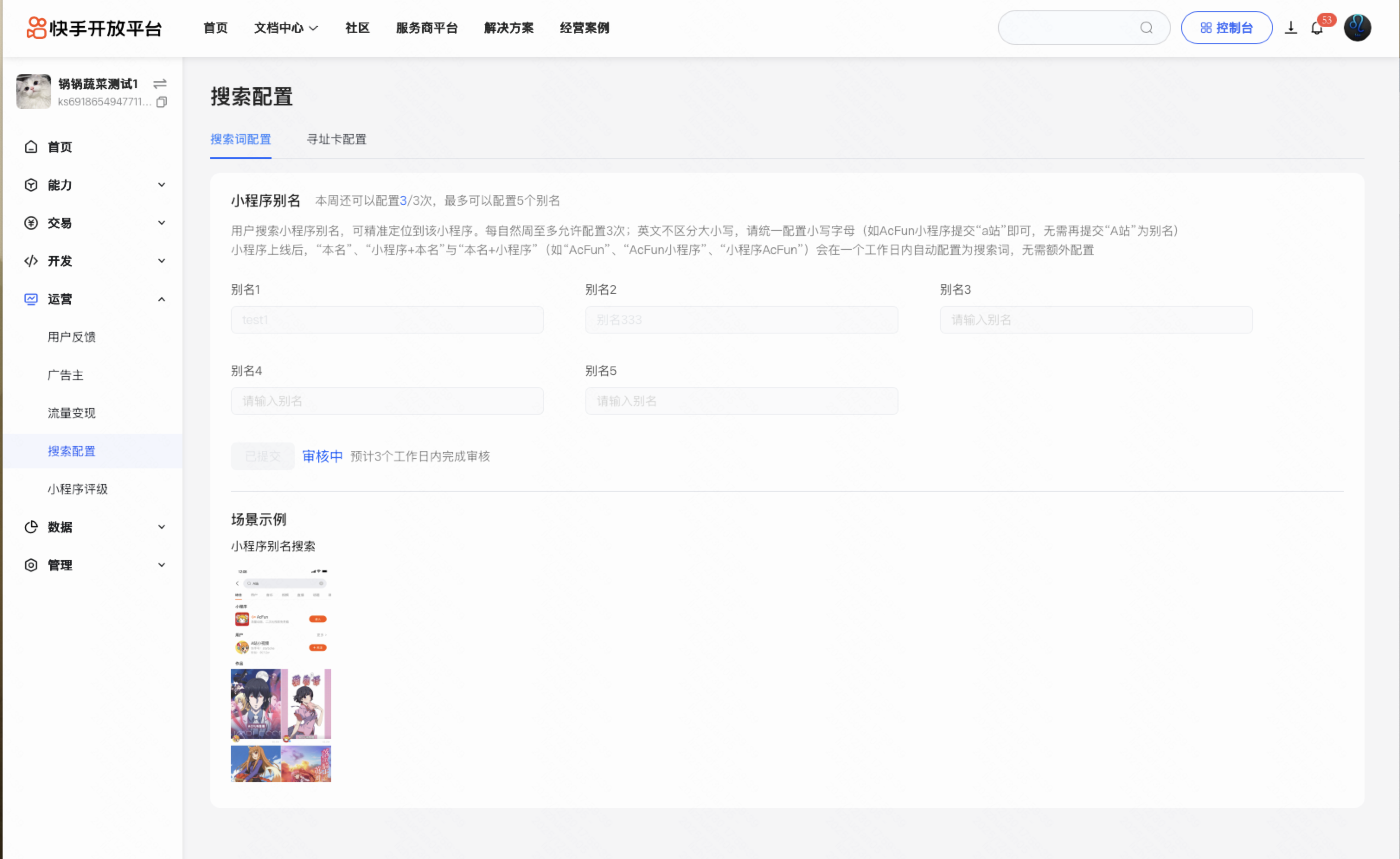 登录小程序开发者平台账号 (https://open.kuaishou.com (opens new window)), 在“运营-搜索配置”模块,输入想要增加的别名,输入完成后点击提交,审核通过后即可使用别名搜索。