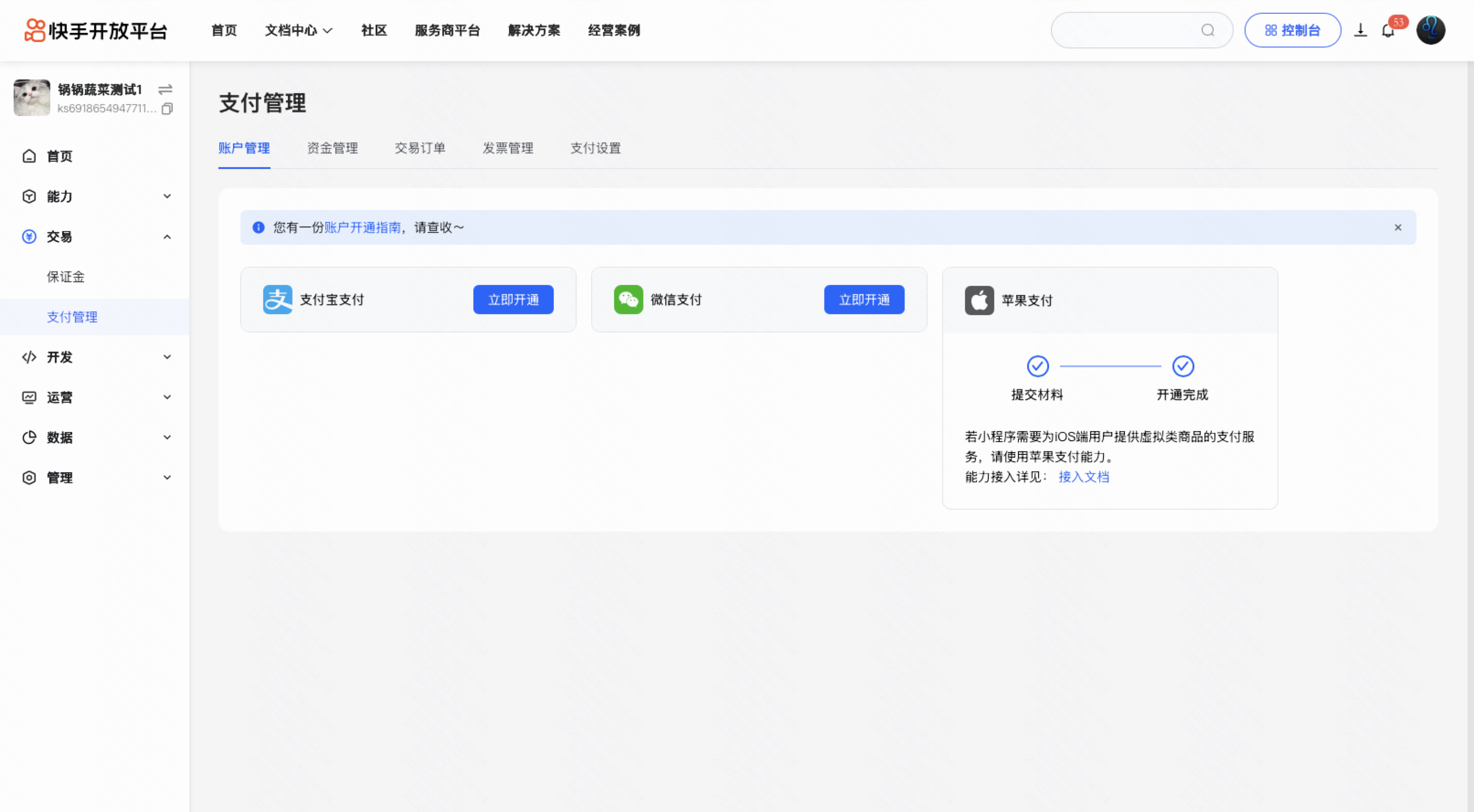 进入 交易 - 支付管理 页面,填写商户名称、业务场景描述,勾选开通的支付方式、支付类型、经营类目,进行开通申请,审核周期为3个工作日内。