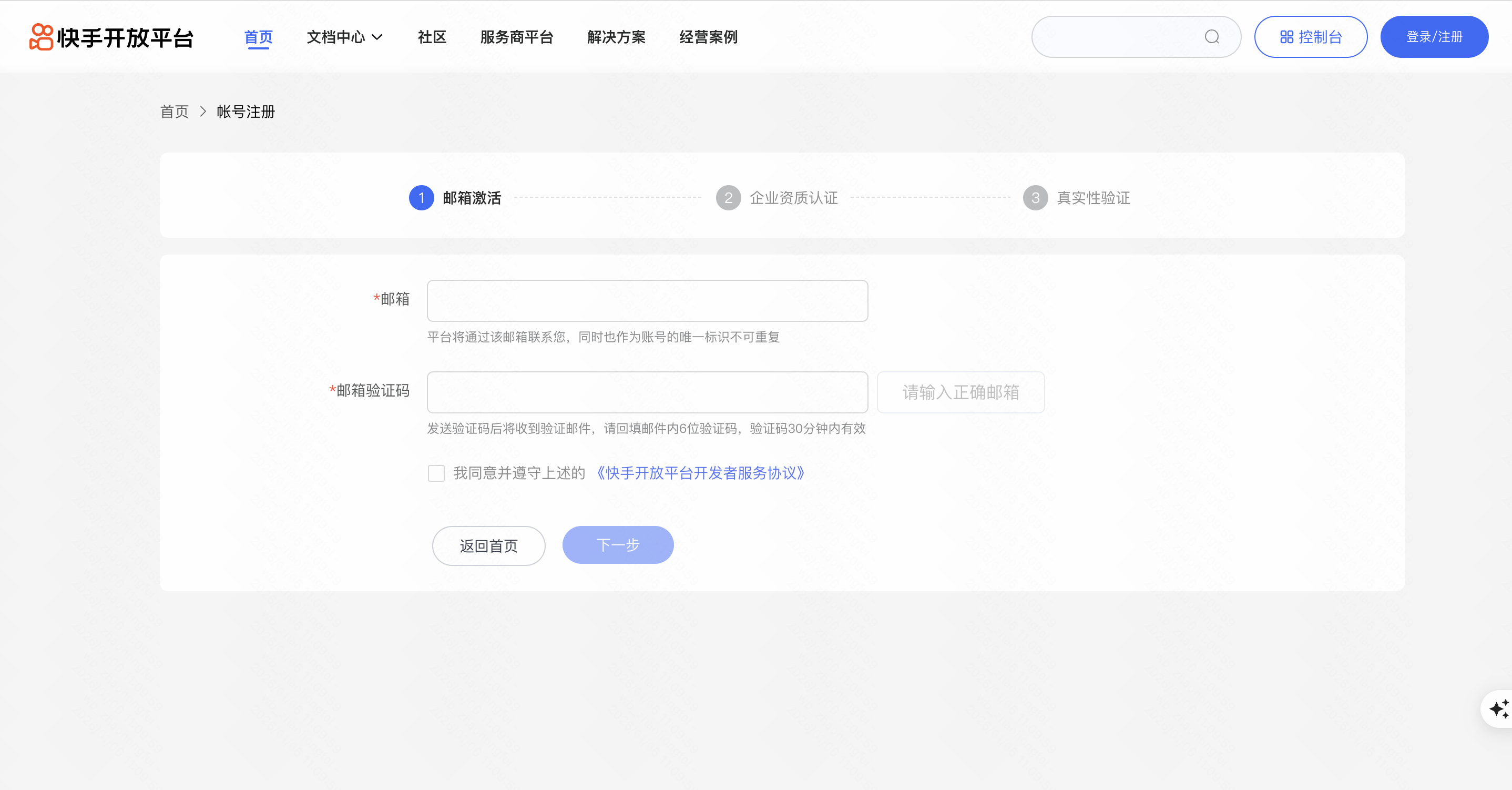 - 填写邮箱信息并完成邮箱验证,邮箱详细要求请参考具体运营规范,激活邮箱前需阅读并同意《快手小程序平台服务协议》及《快手开放平台开发者服务协议》。