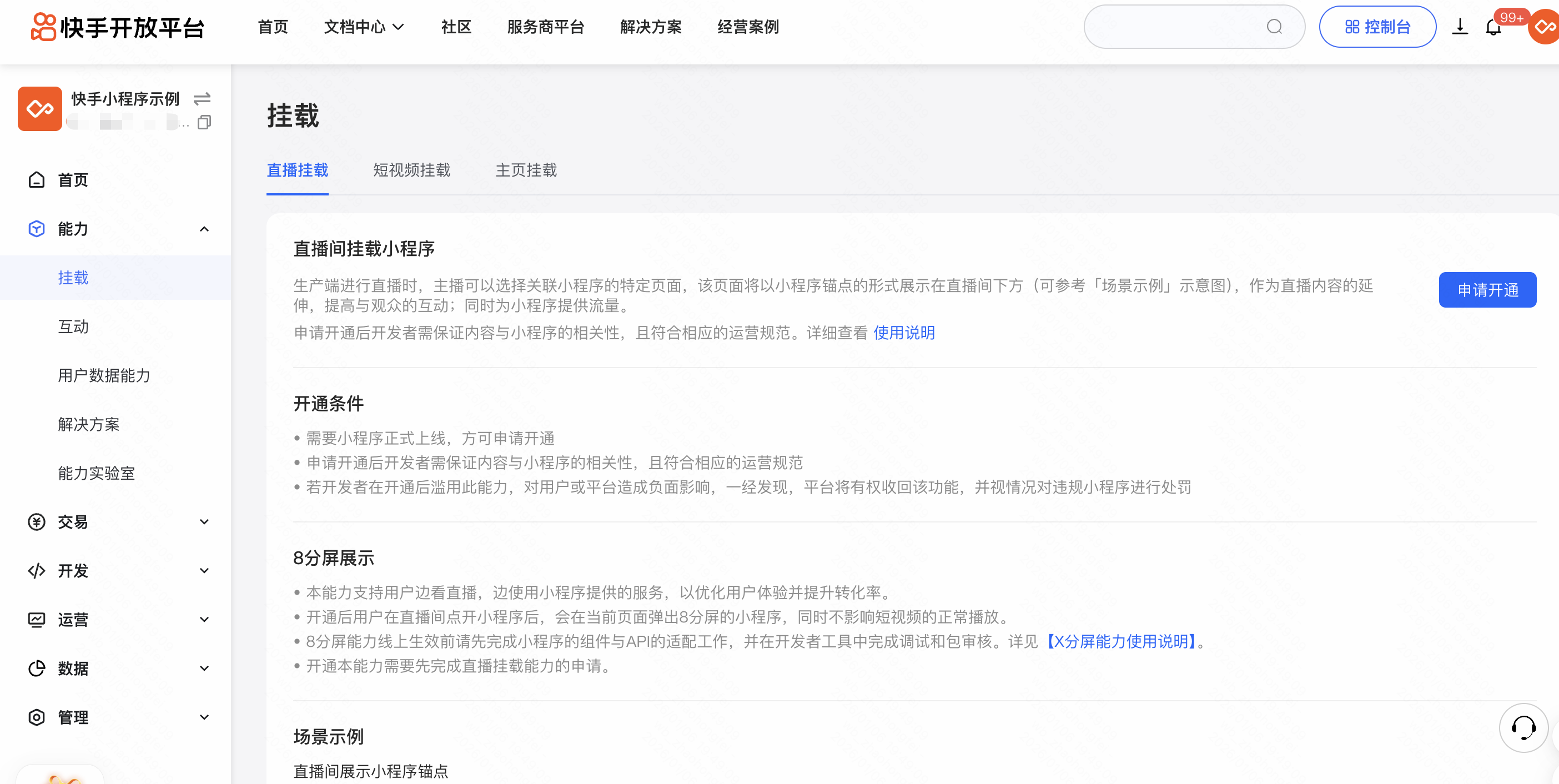 - 进入小程序开发者平台,在【能力板块】-【挂载】-【直播挂载】处申请开通直播间挂载能力。