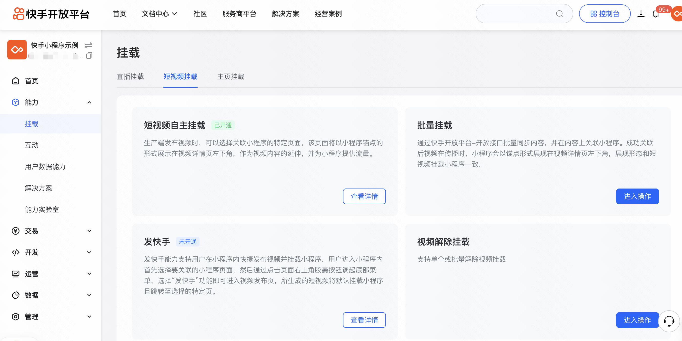 进入小程序开发者平台,在【能力板块】-【挂载】-【短视频挂载】处申请开通短视频挂载能力。