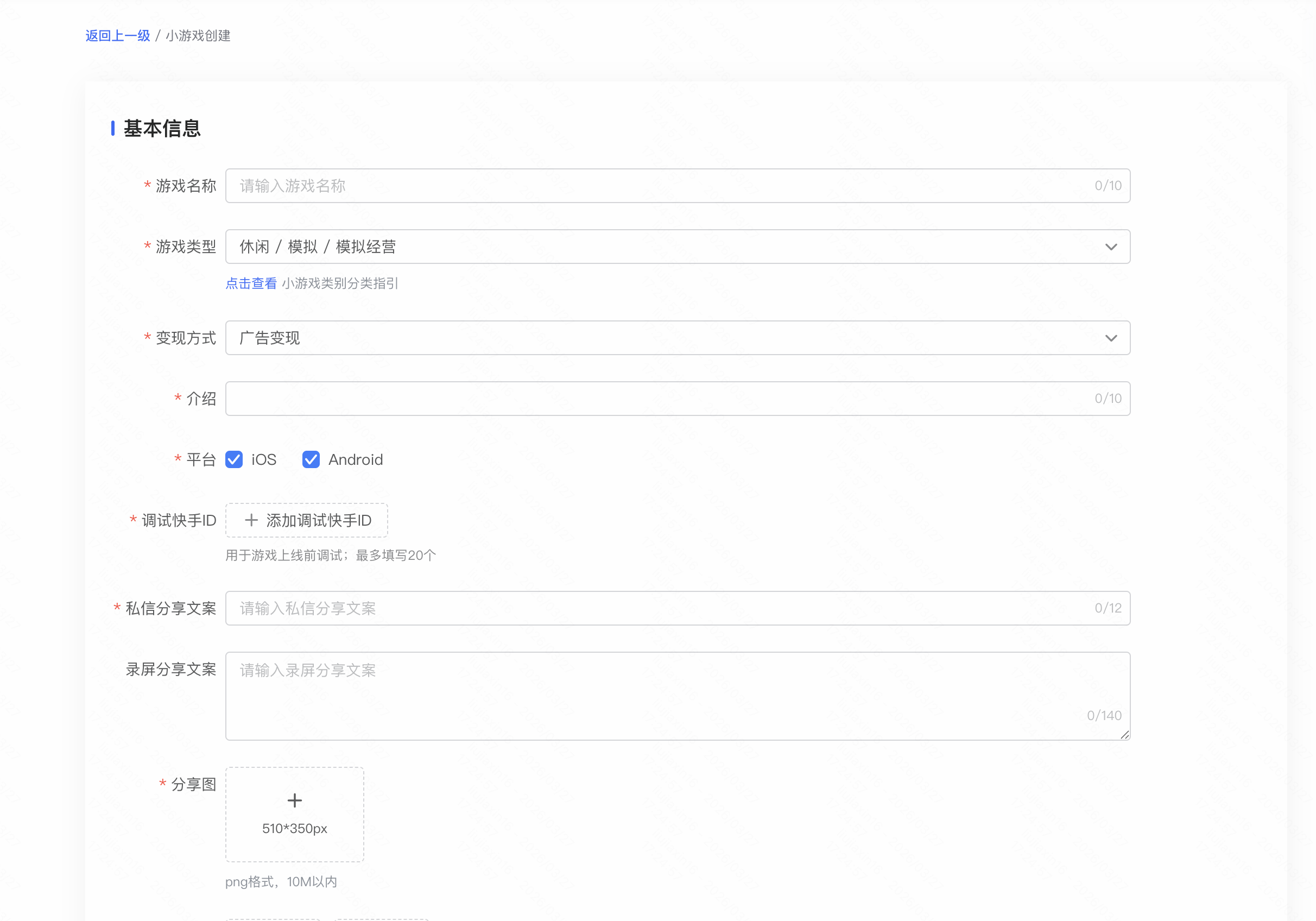 2.开放平台入驻后,在开放平台上创建自己的小游戏